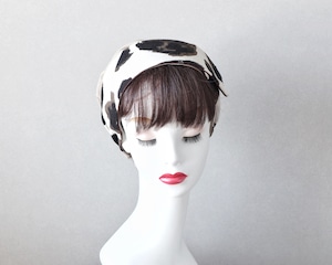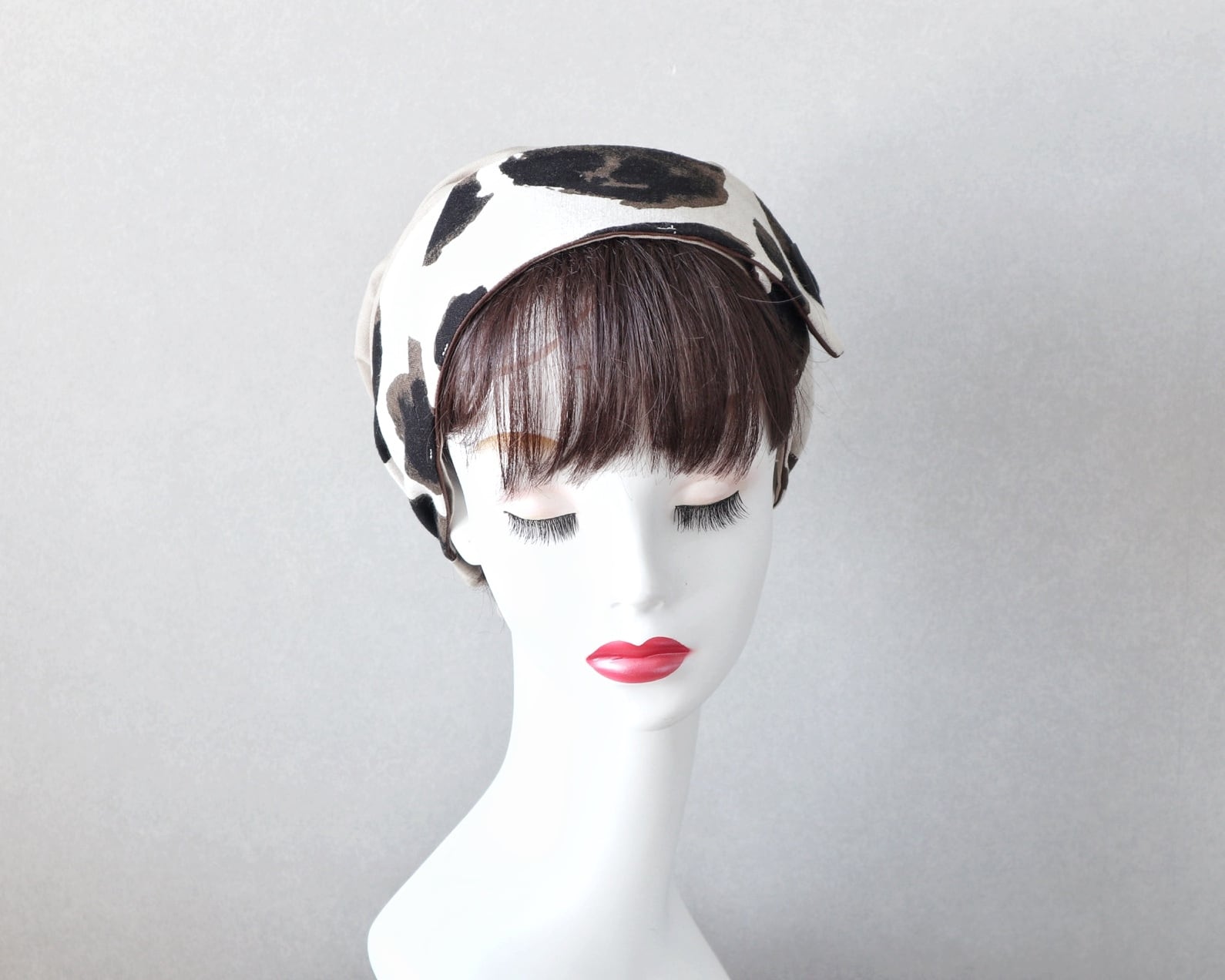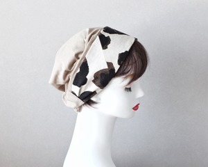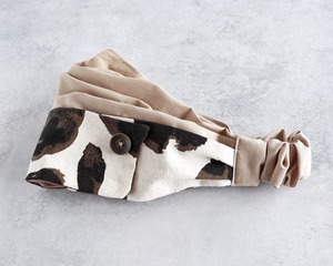 ペイントタッチで描かれた牛柄模様が目を引く、遊び心あふれるヘアターバンです。