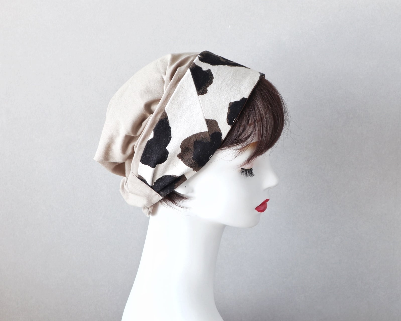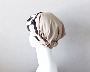 ヘアターバンの形状で、頭部をしっかりとカバーし、ずれにくいデザインです。