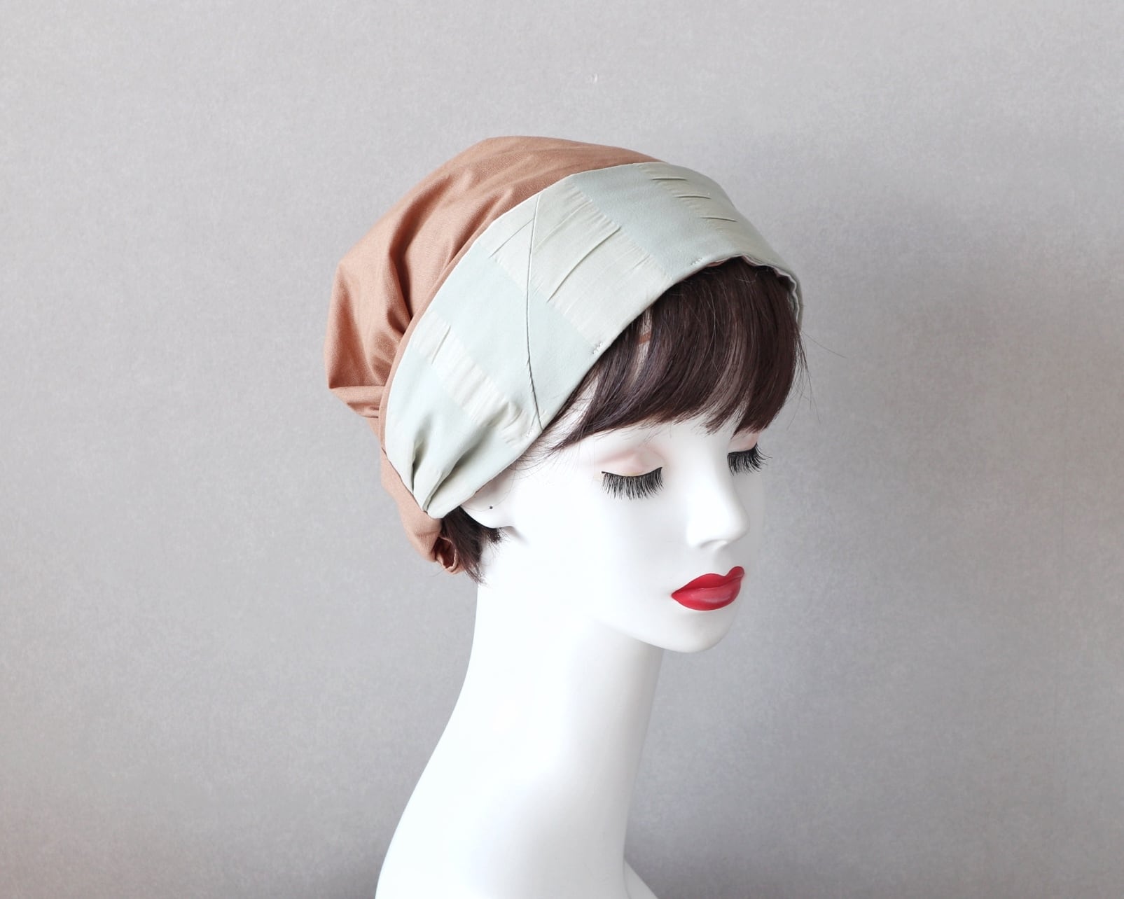 This hair turban has a gentle atmosphere, with pale green fabric and delicate tucks creating a three-dimensional border pattern.