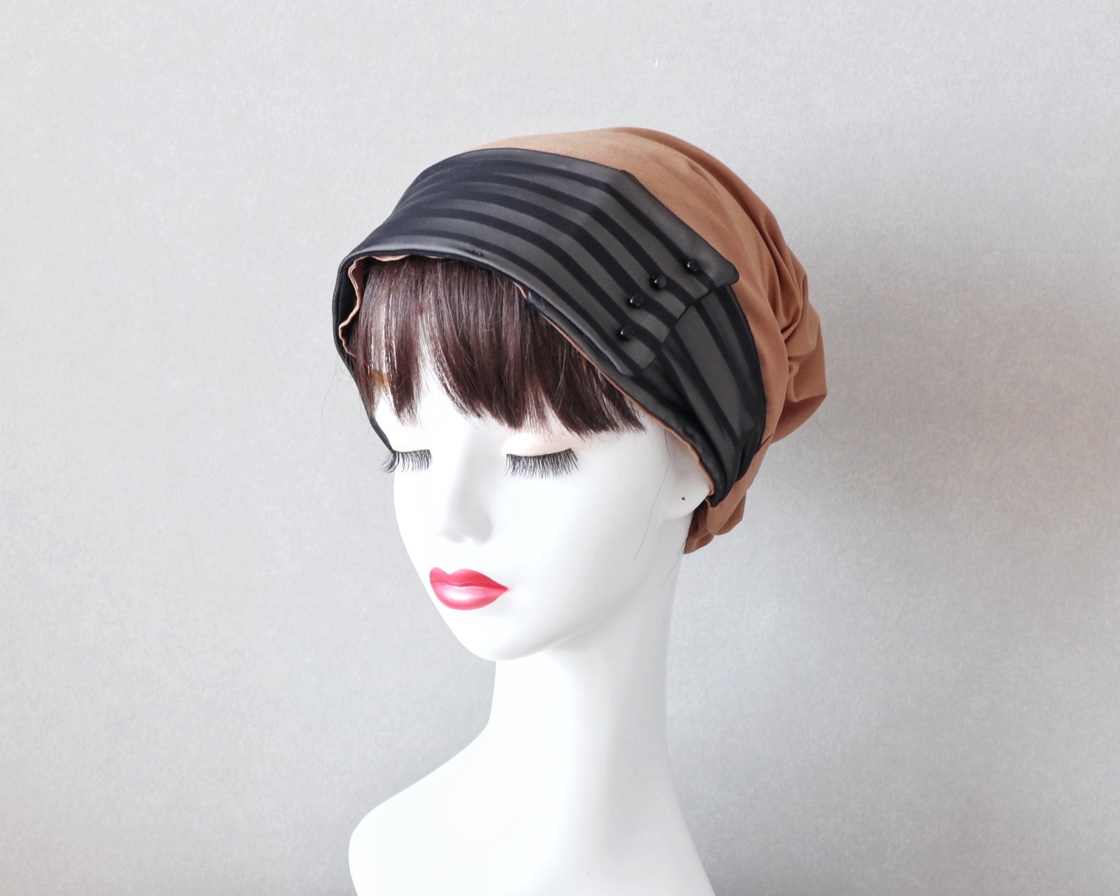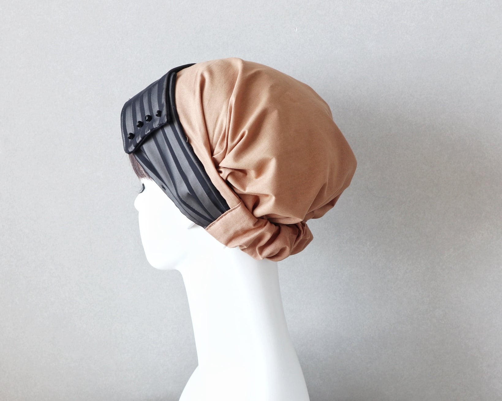 ヘアターバンの形状で、頭部をしっかりとカバーし、ずれにくいデザインです。