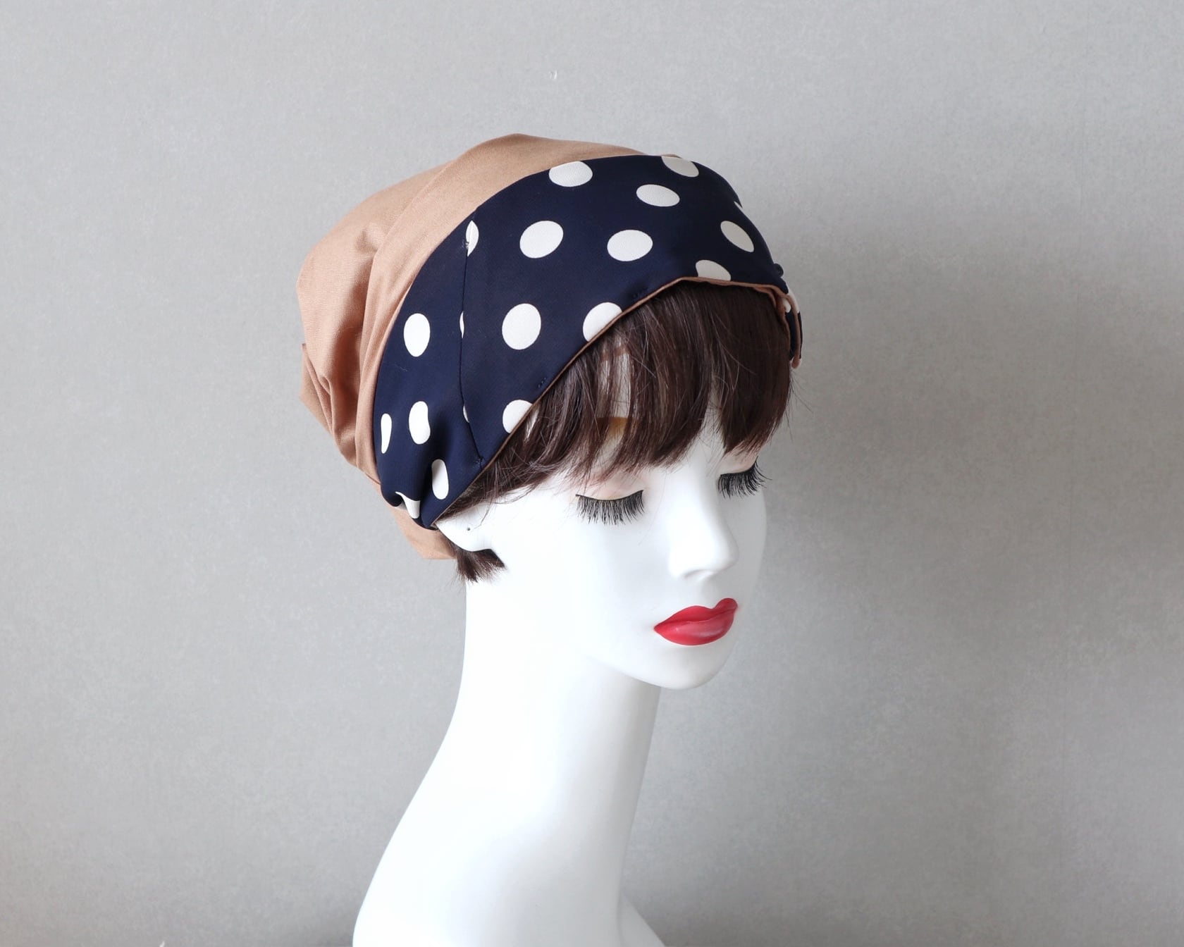 ヘアターバンの形状で、頭部をしっかりとカバーし、ずれにくいデザインです。