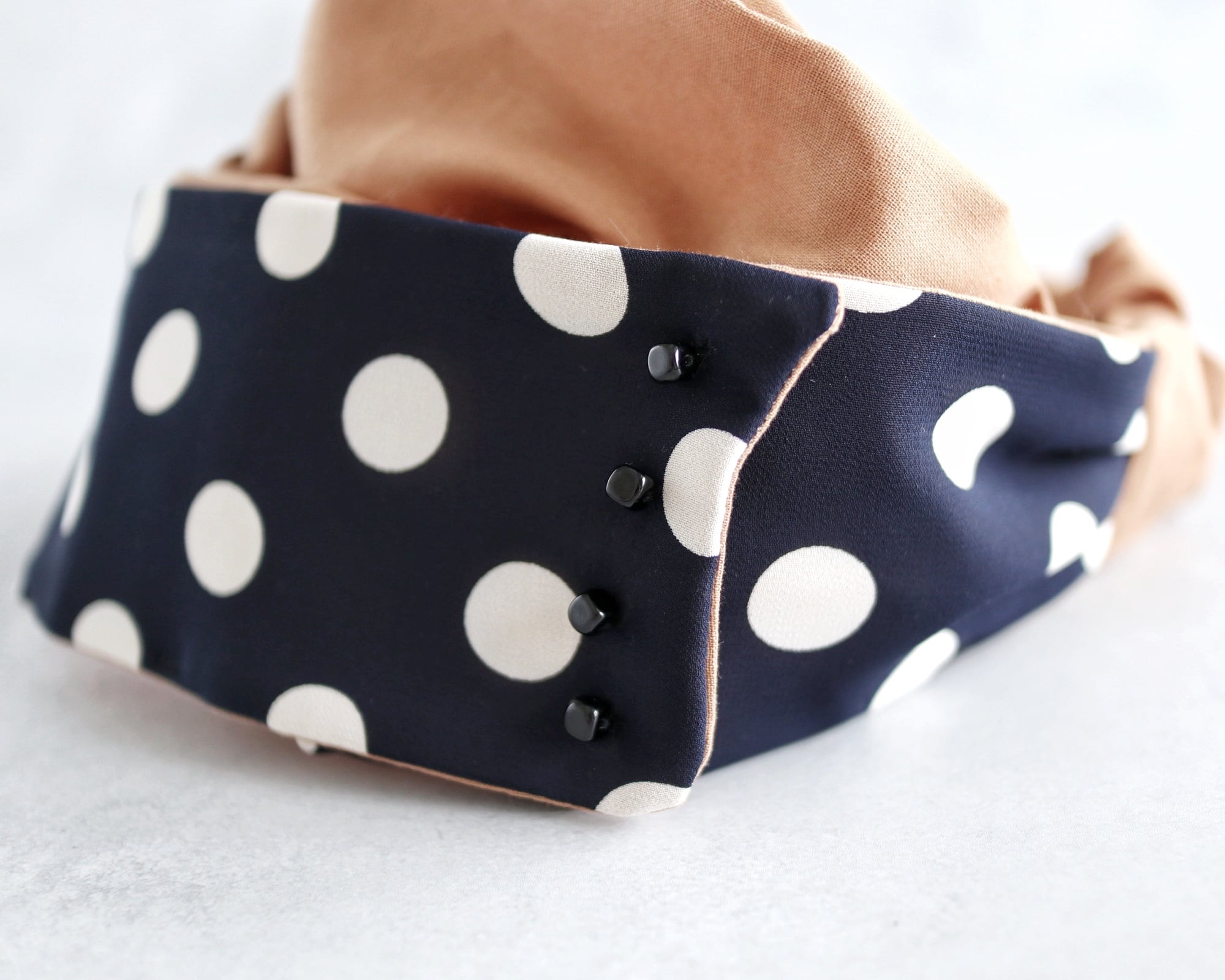 ボタン付きサッシュベルト(レトロなドット柄/濃紺)とキャラメルカラー:Buttoned sash belt (retro polka dot pattern/dark blue) and caramel color