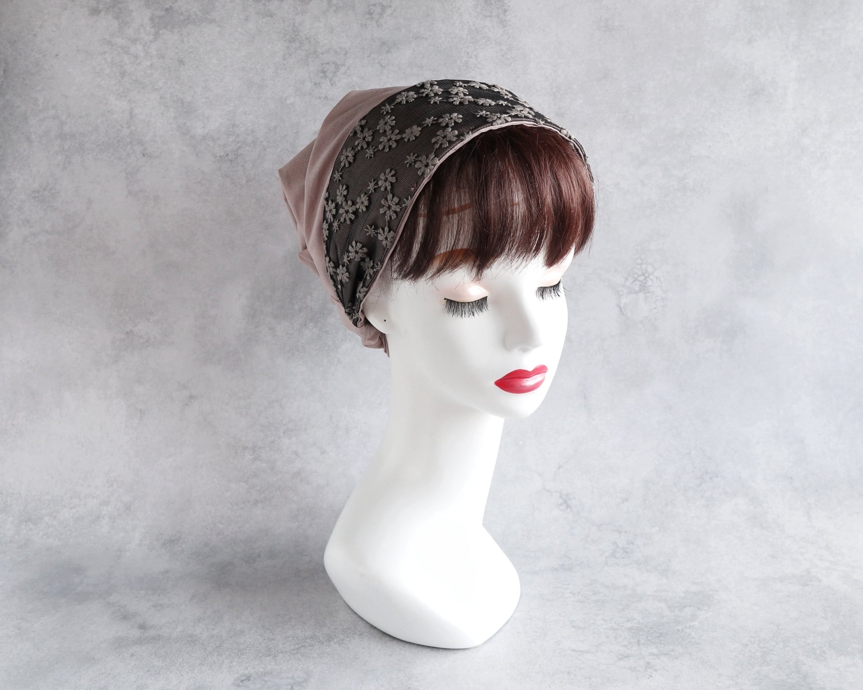 ヘアターバンの形状で、頭部をしっかりとカバーし、ずれにくいデザインです。