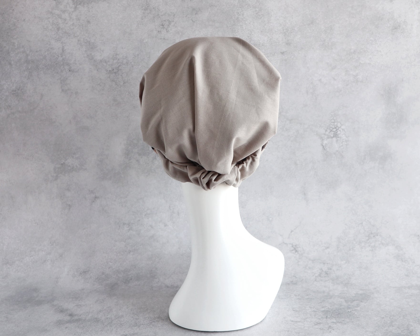 ヘアターバンの形状で、頭部をしっかりとカバーし、ずれにくいデザインです。