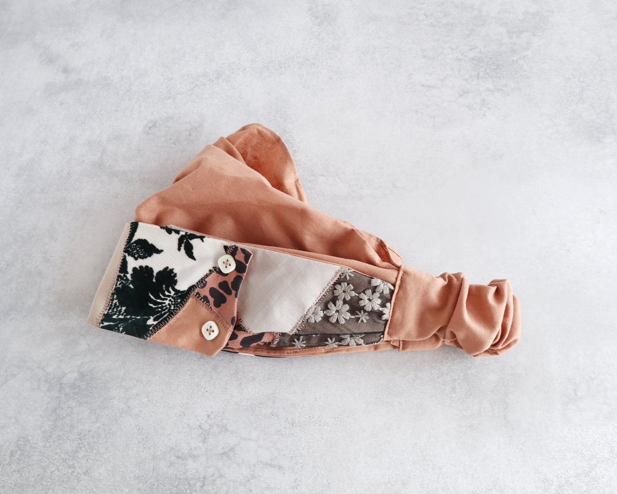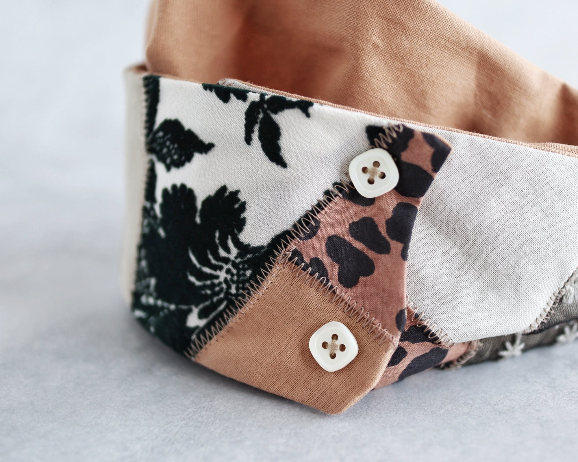 可憐な花柄と遊び心のある水玉模様を絶妙なバランスで組み合わせ、ひとつひとつ丁寧に仕上げたパッチワーク風のヘアターバンです。