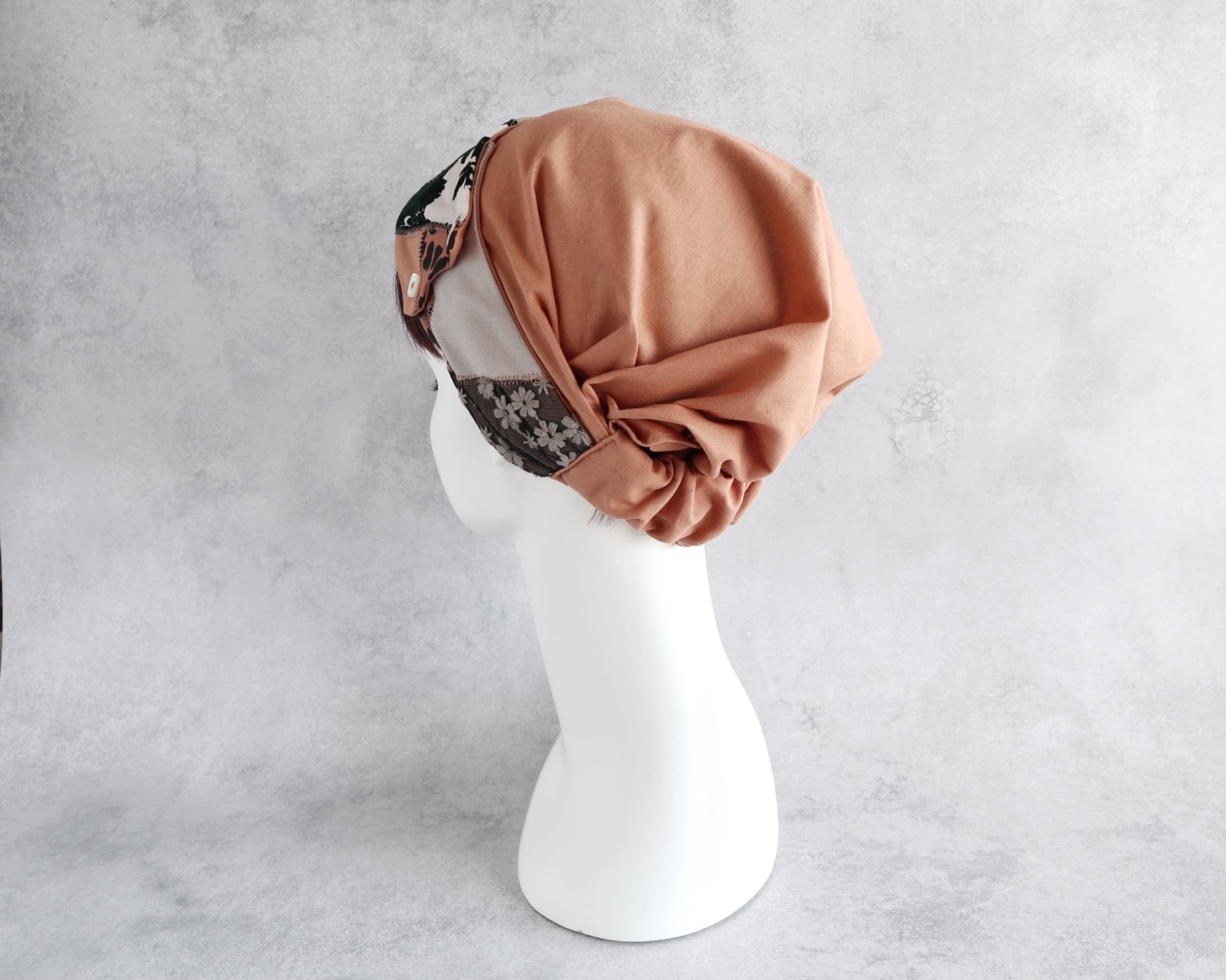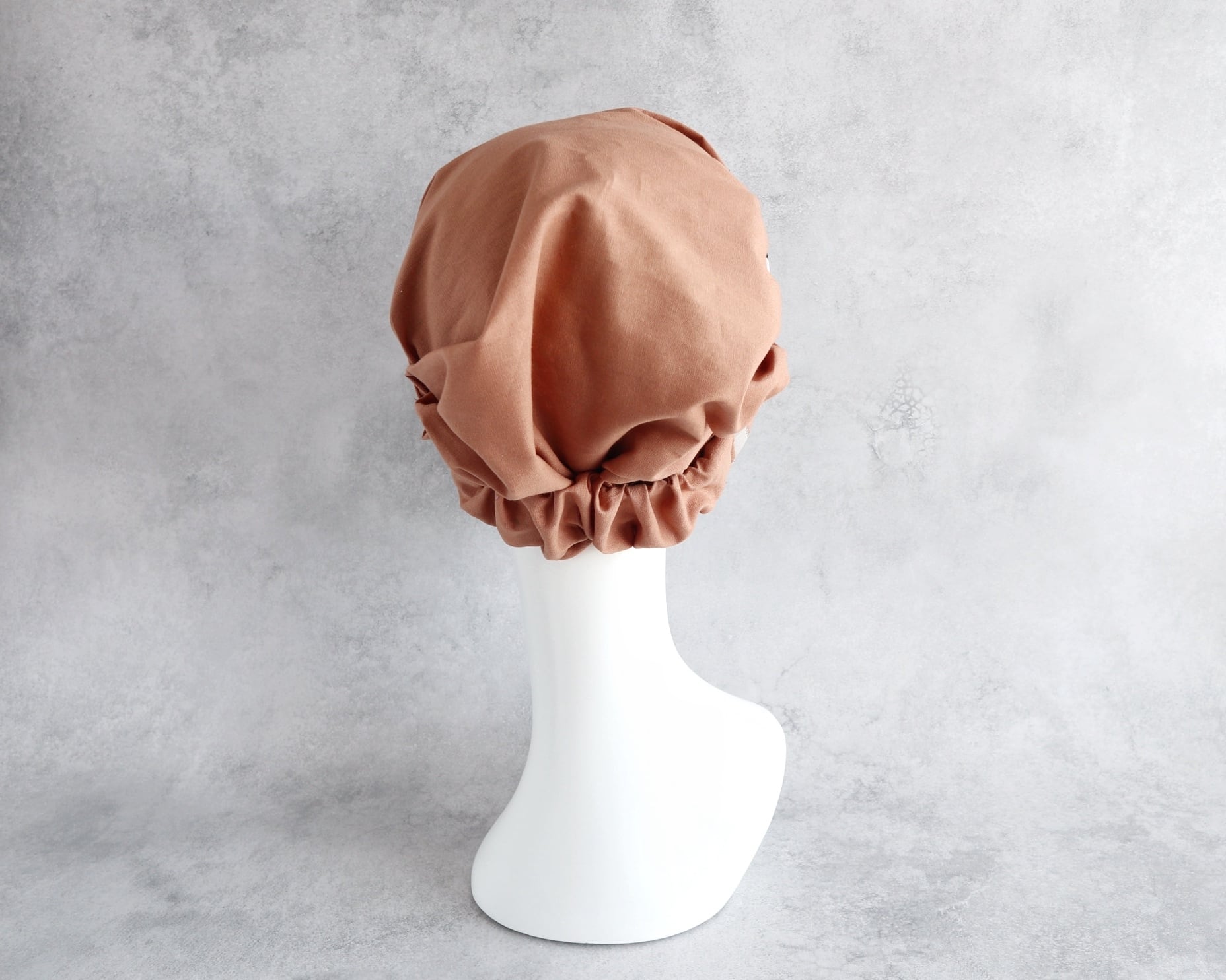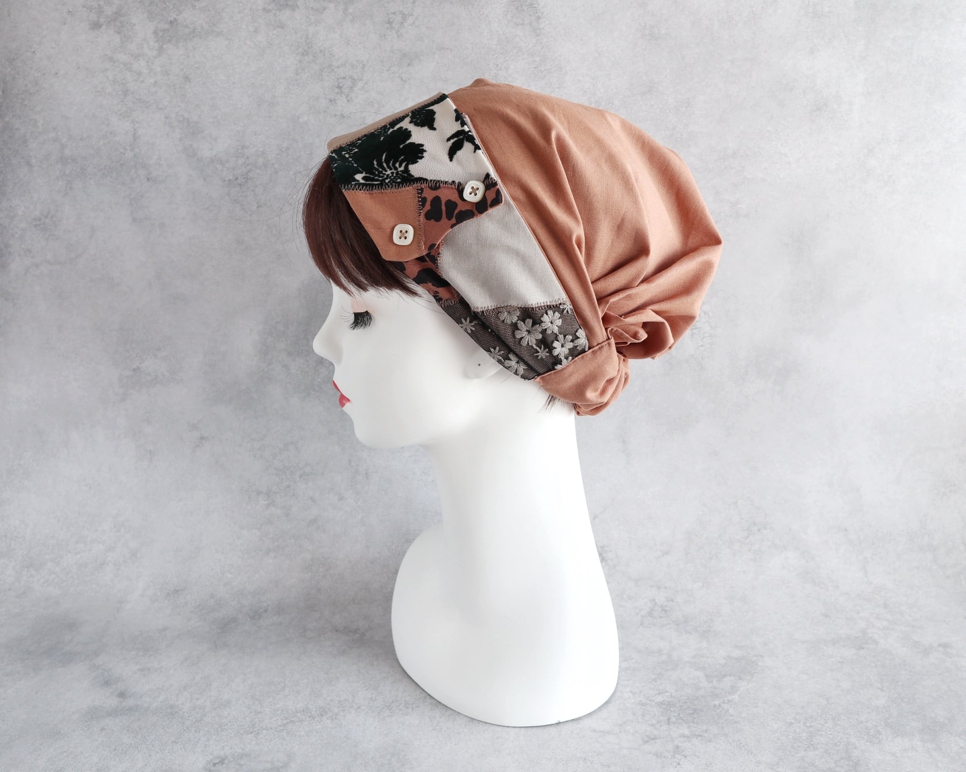 ヘアターバンの形状で、頭部をしっかりとカバーし、ずれにくいデザインです。