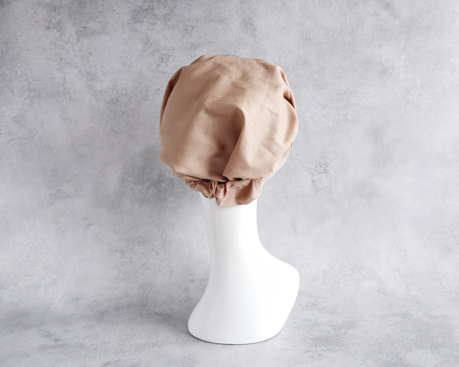 ヘアターバンの形状で、頭部をしっかりとカバーし、ずれにくいデザインです。
