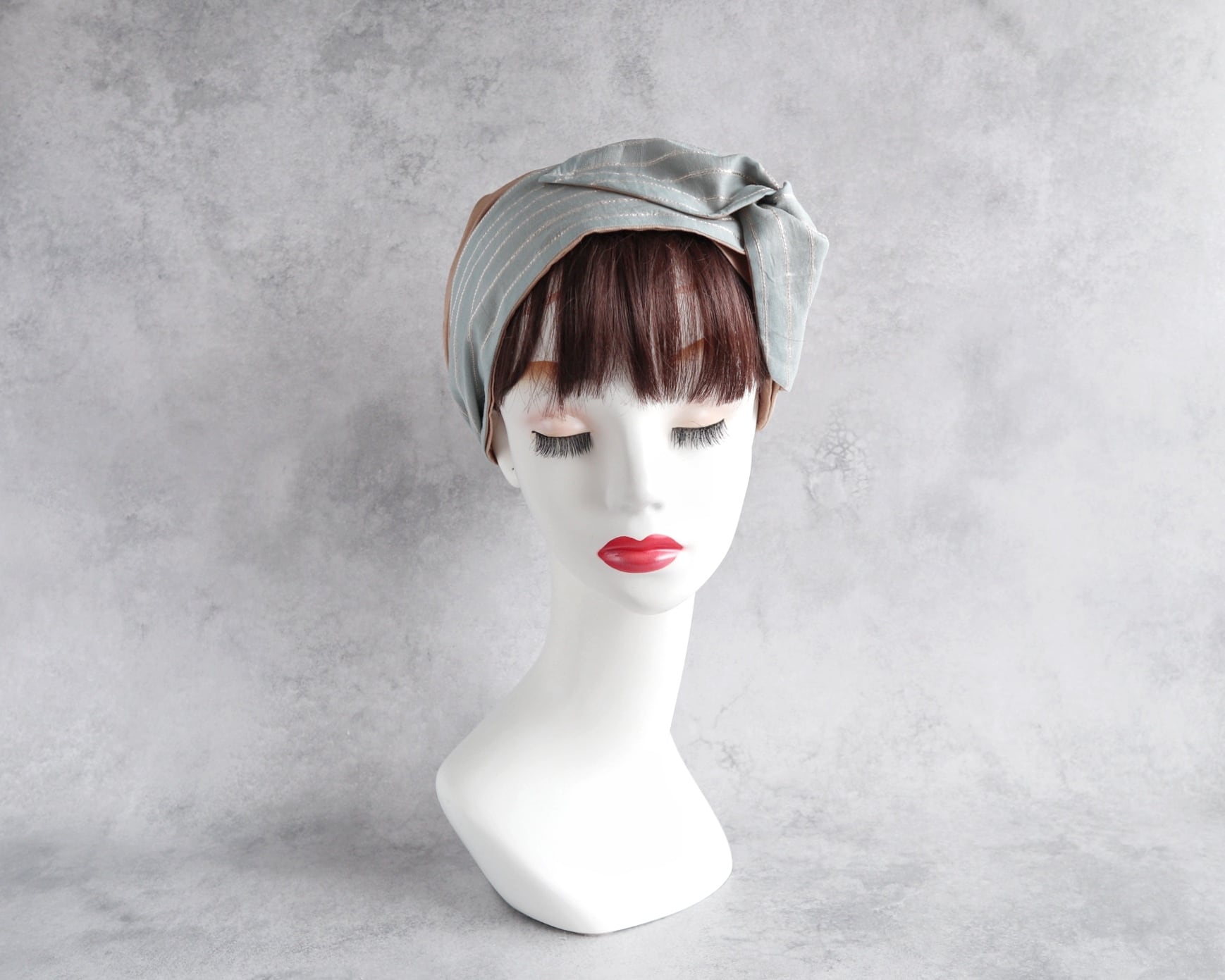 レトロな色合いのペパーミントグリーンに、上品な輝きを放つシルバーのストライプをあしらったヘアターバンです。