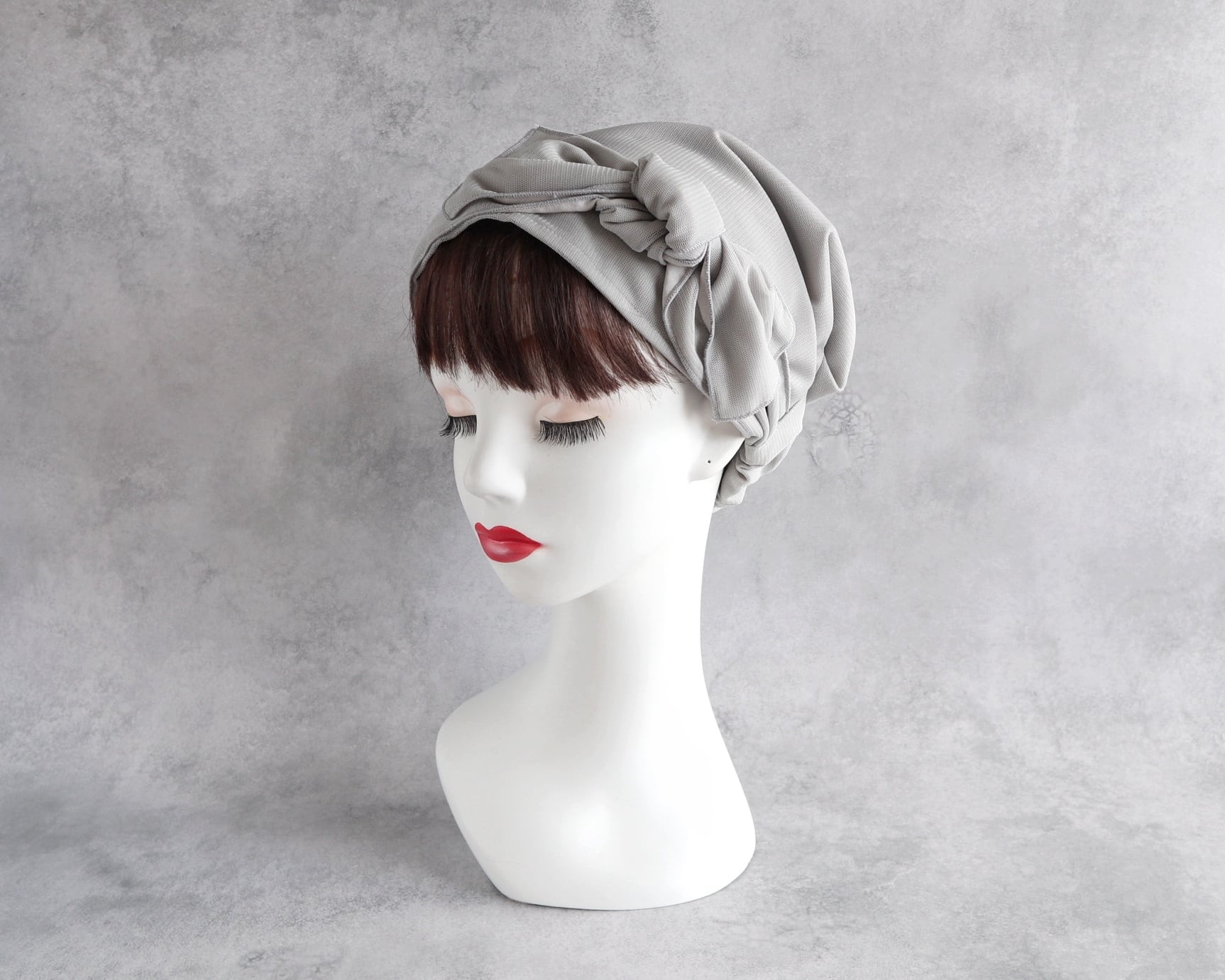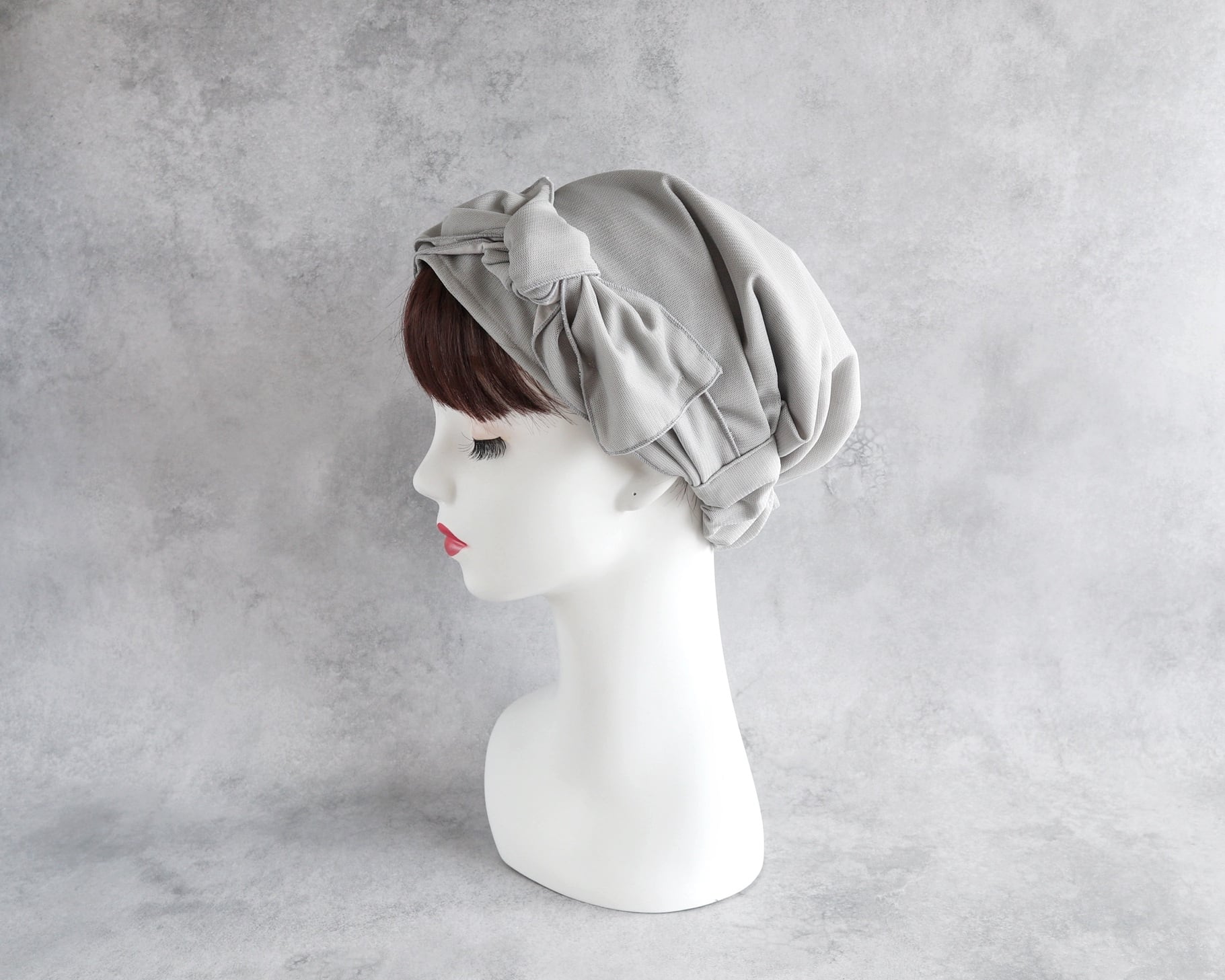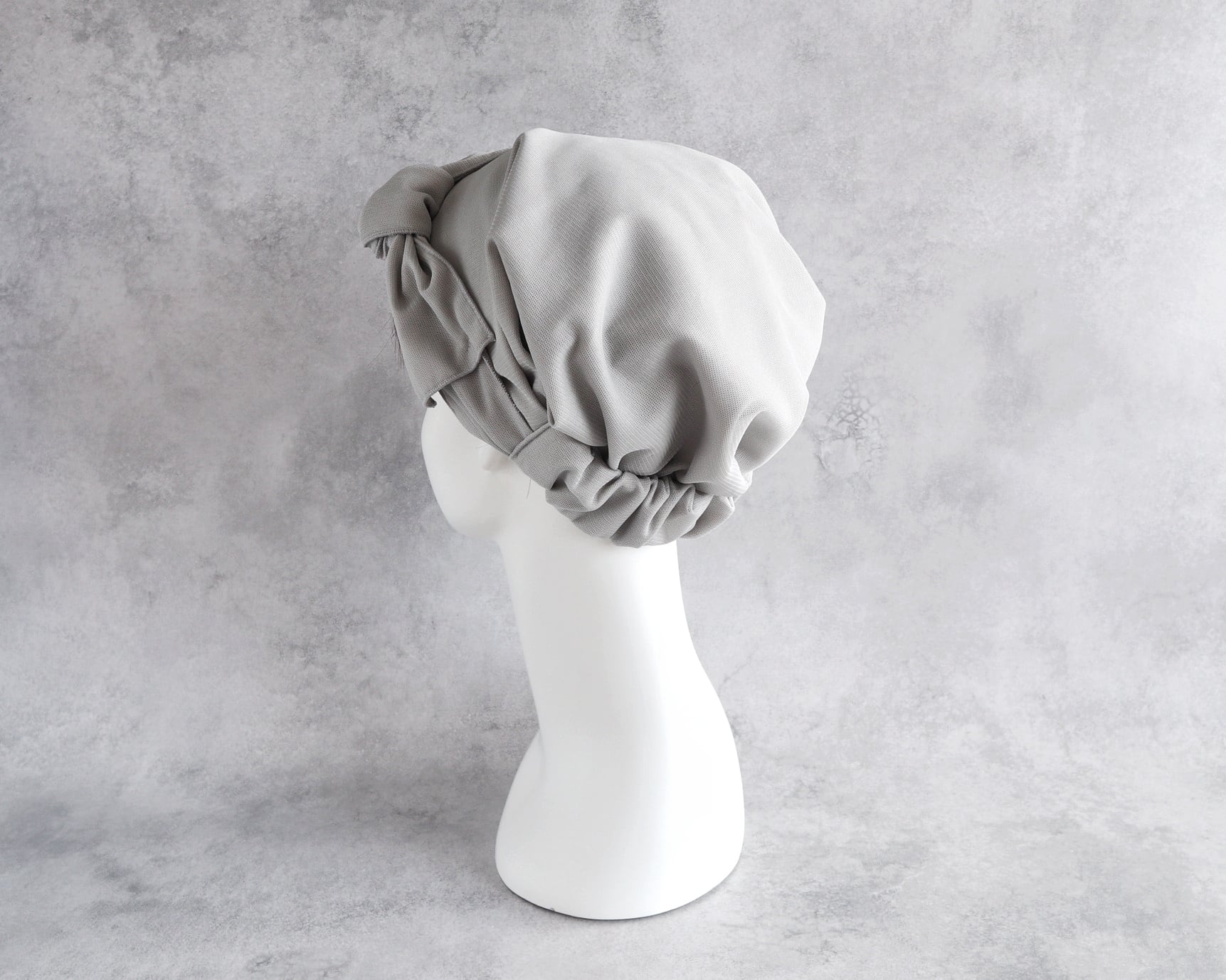 ヘアターバンの形状で、頭部をしっかりとカバーし、ずれにくいデザインです。