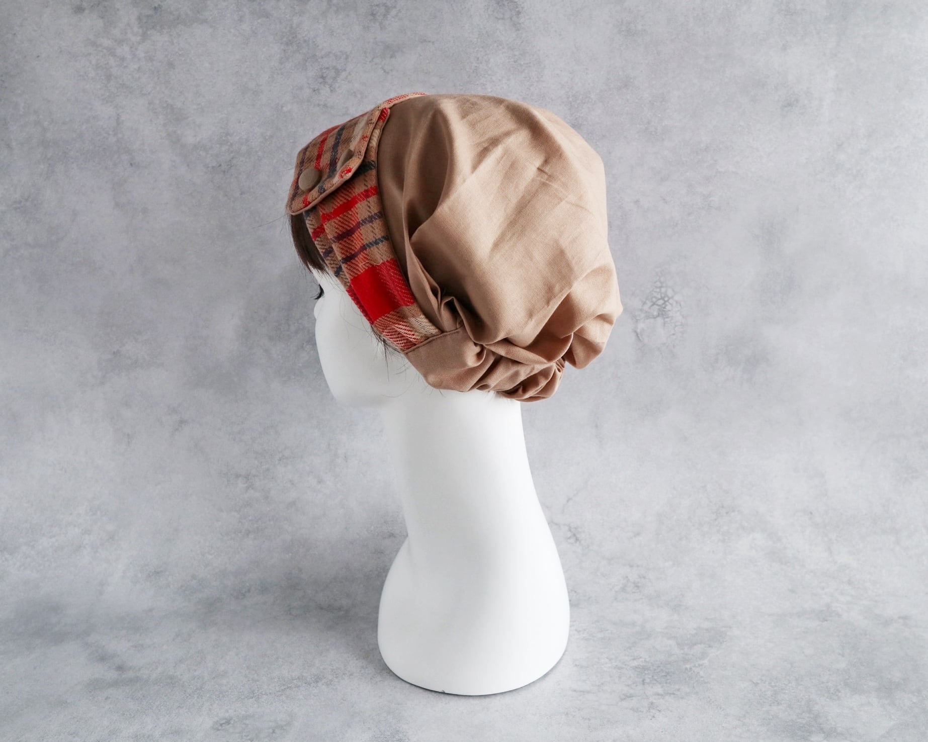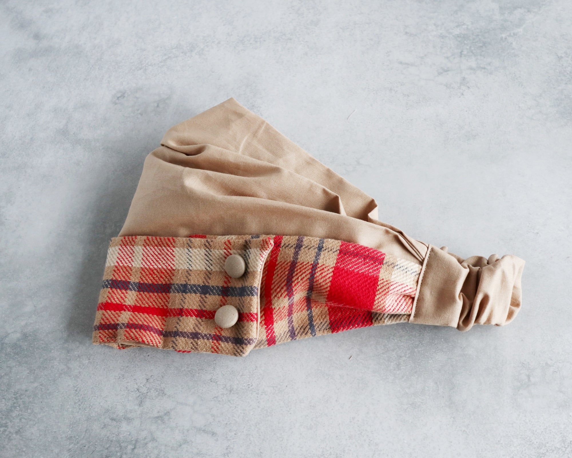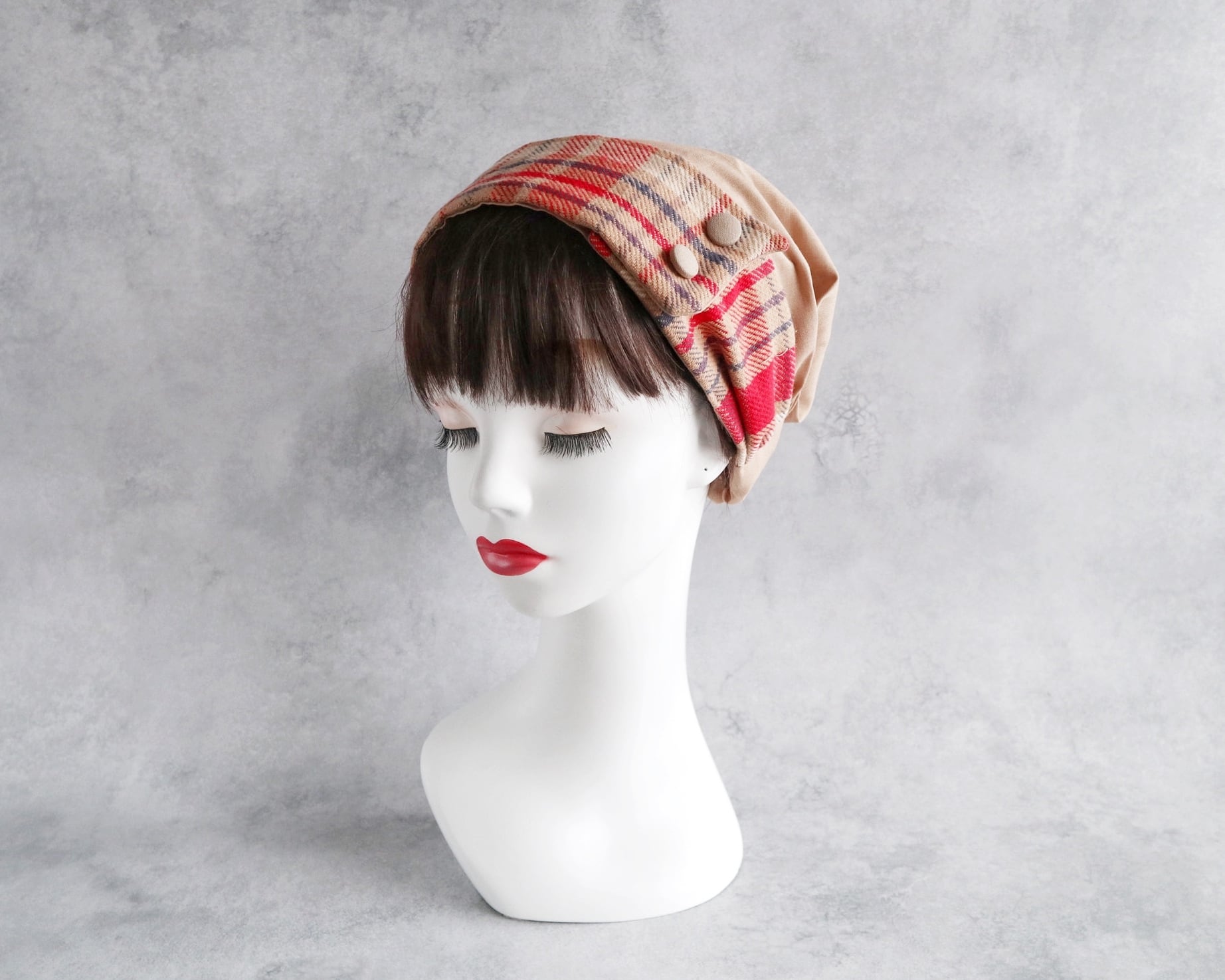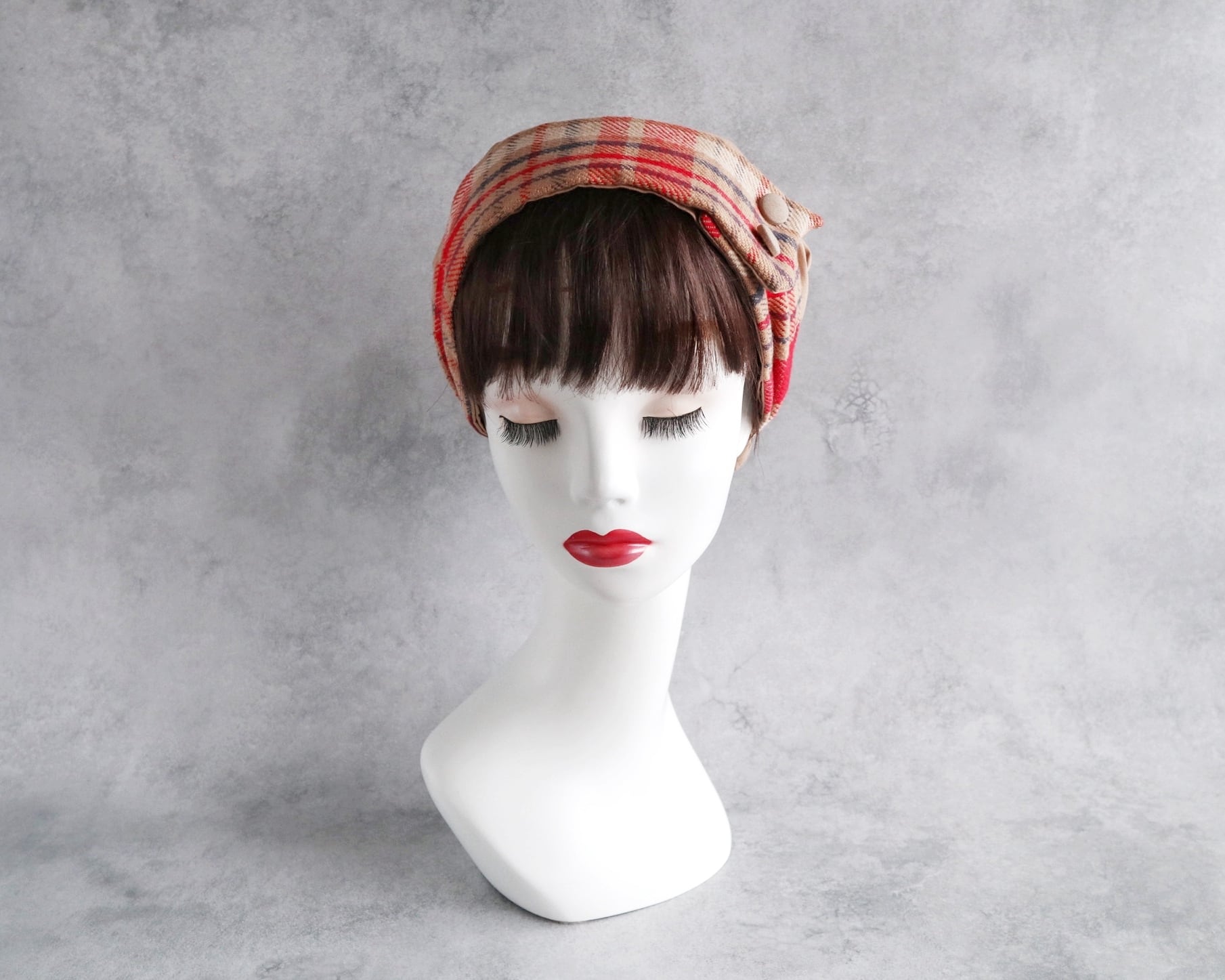 This is a hair turban with a tartan check pattern and a cherry-colored line that stands out.