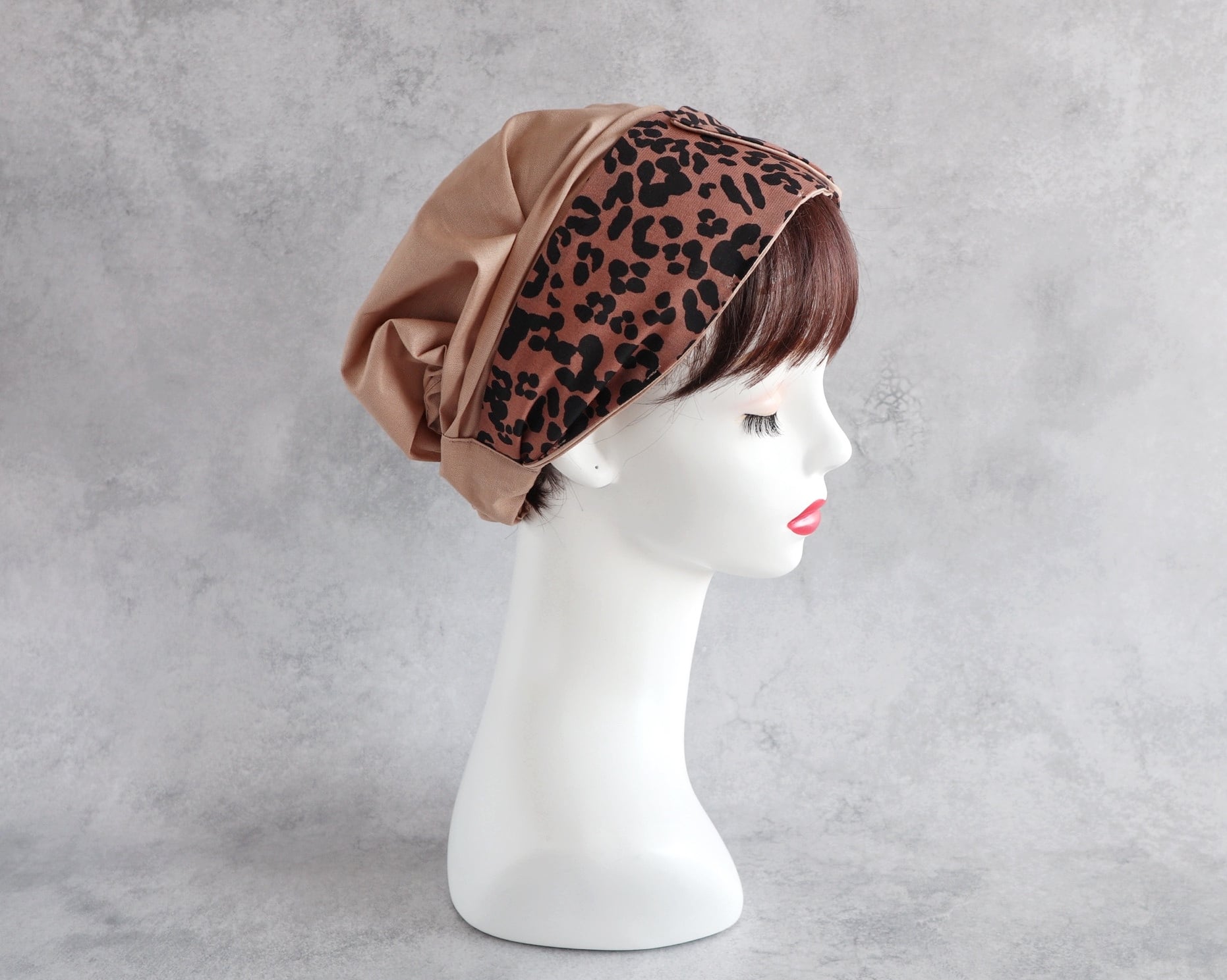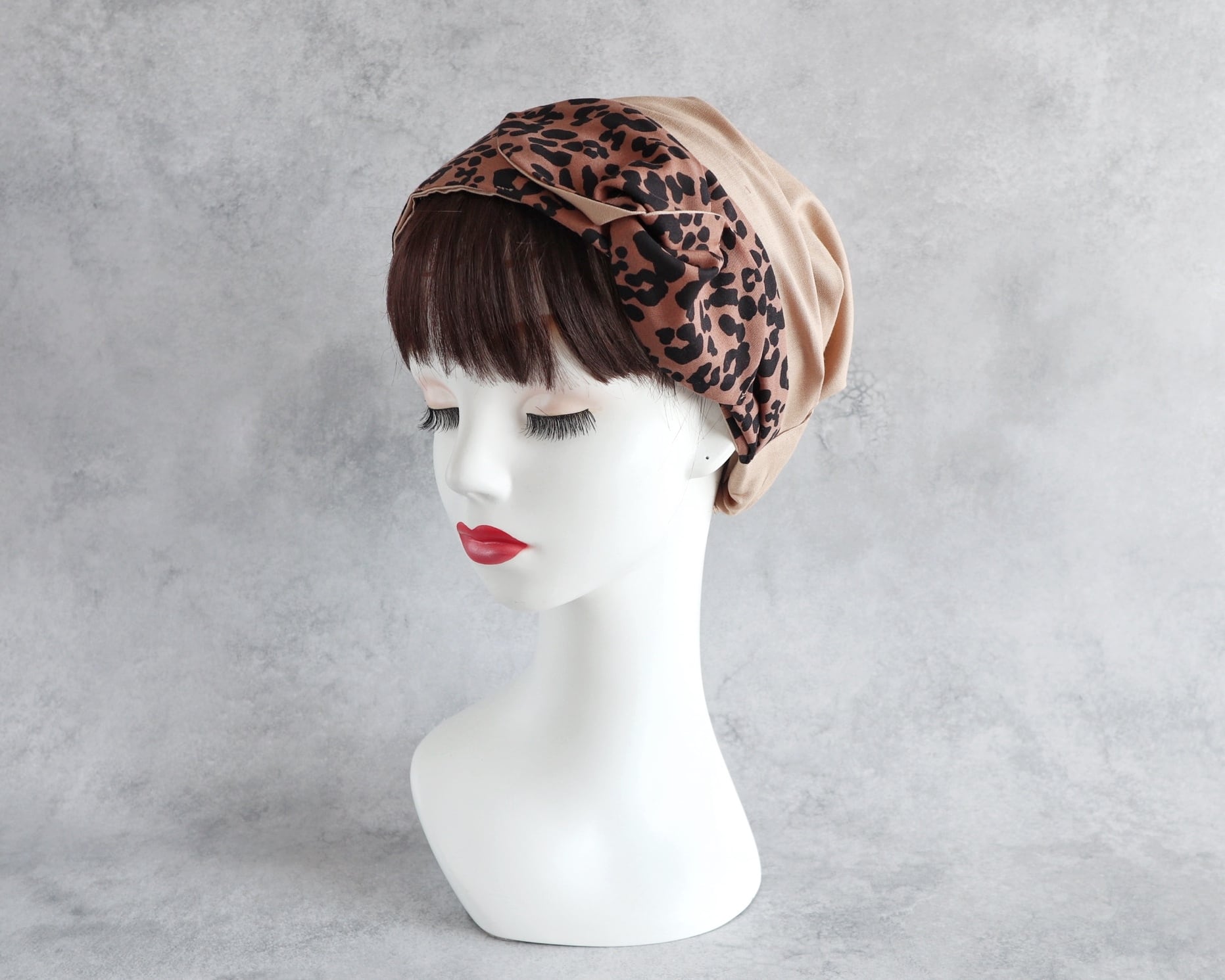 ヘアターバンの形状で、頭部をしっかりとカバーし、ずれにくいデザインです。