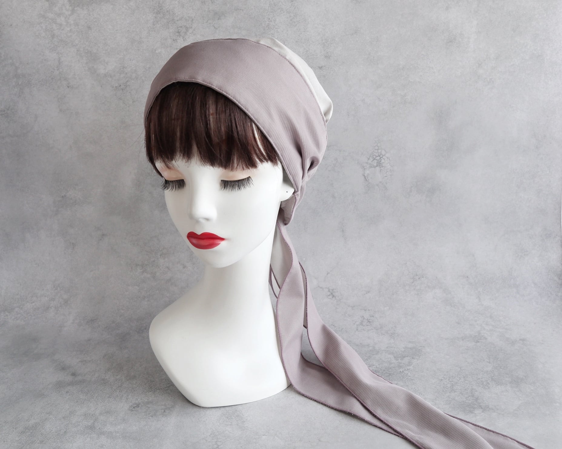 ヘアターバンの形状で、頭部をしっかりとカバーし、ずれにくいデザインです。