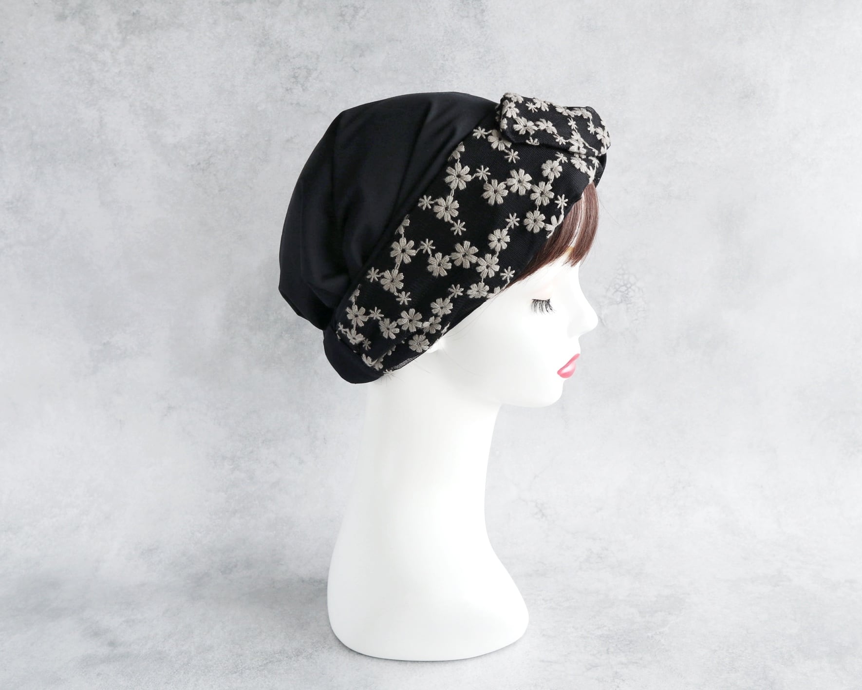 深みのあるブラック生地を組み合わせることで、甘さを抑えた大人のシックな雰囲気に仕上げています。