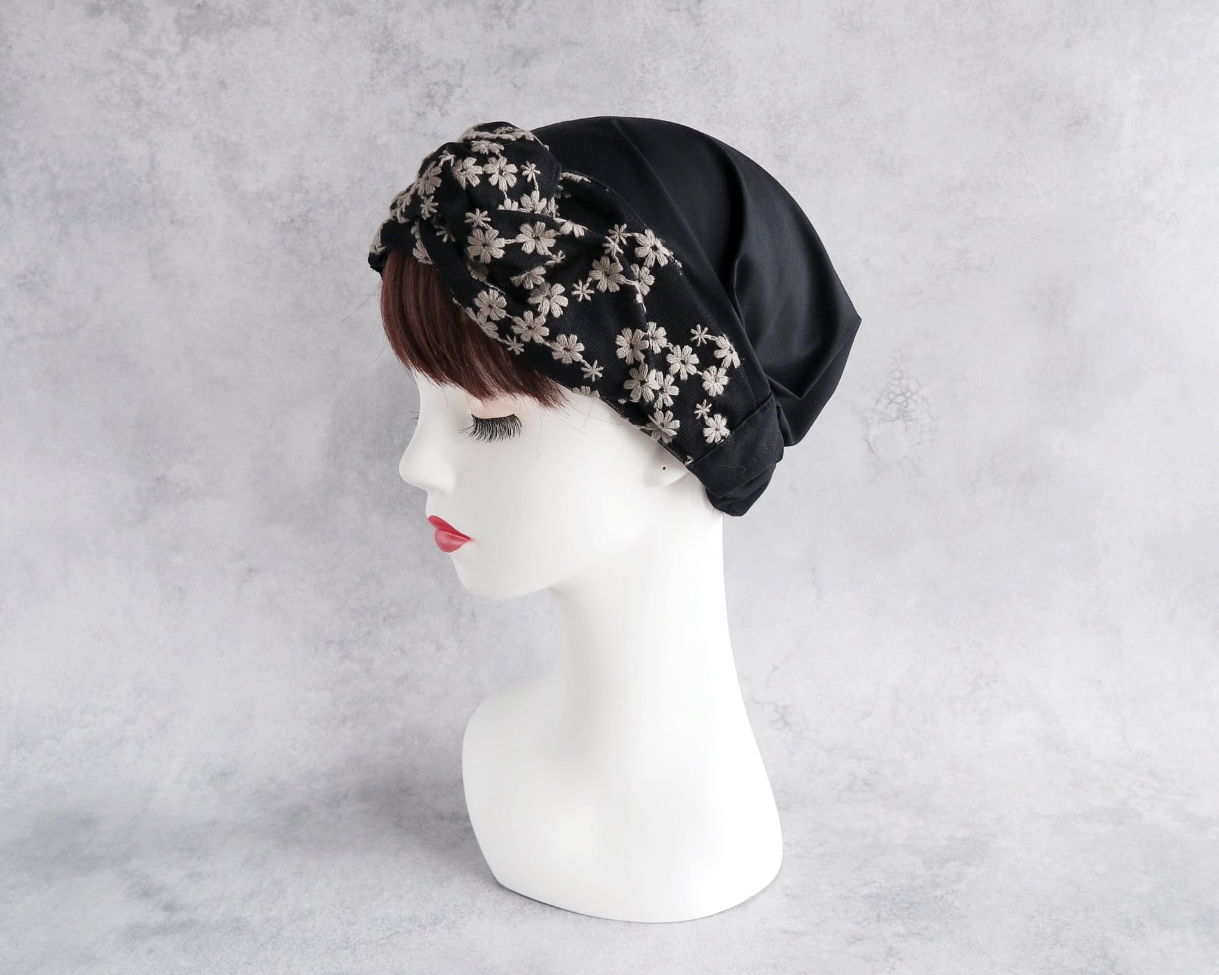 ヘアターバンの形状で、頭部をしっかりとカバーし、ずれにくいデザインです。