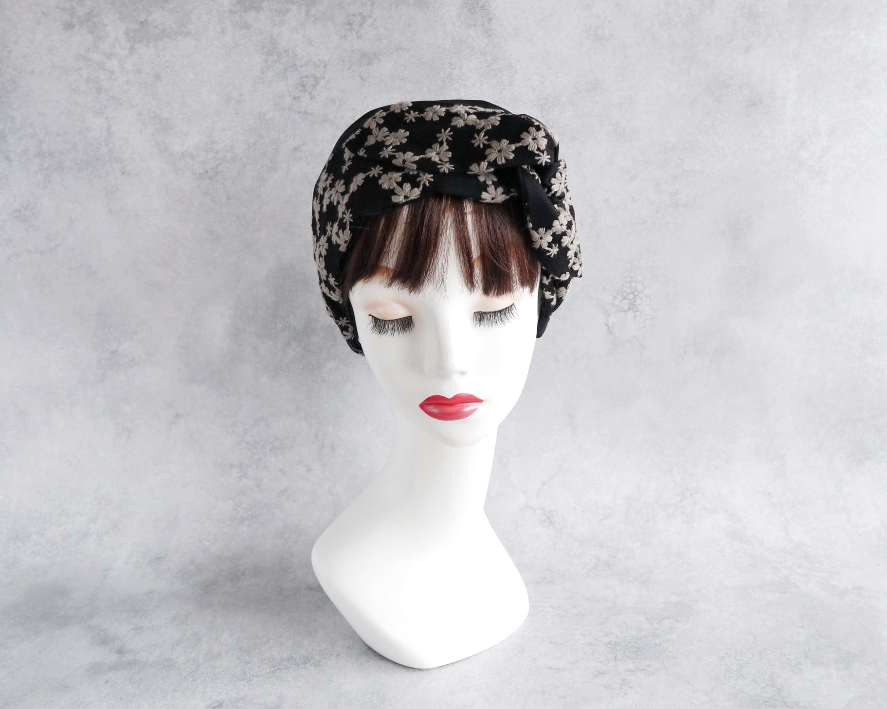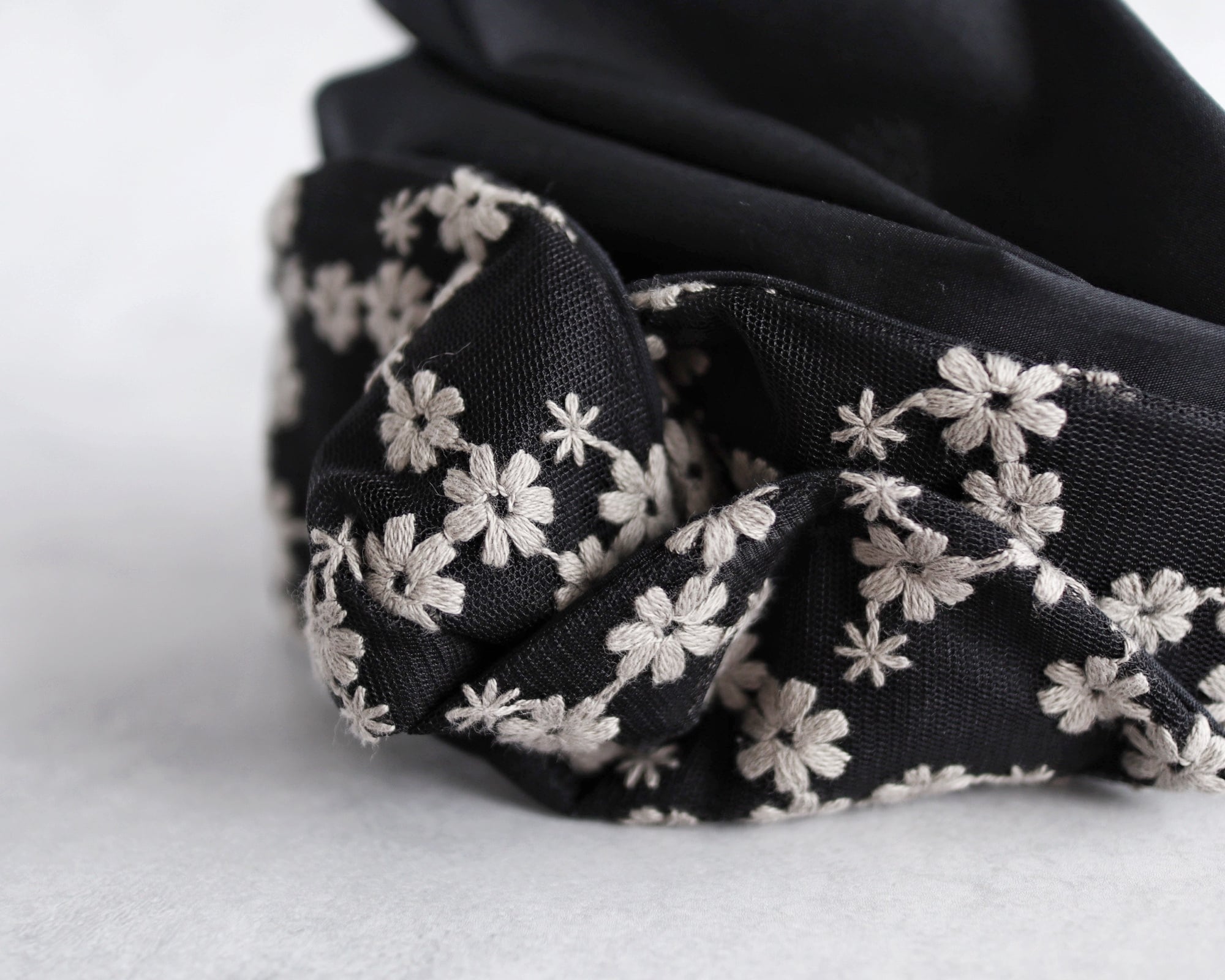 オリーブ色の花柄刺繍チュールにコットンを重ね、繊細さと柔らかさを引き立てたエレガントなヘアターバンです。