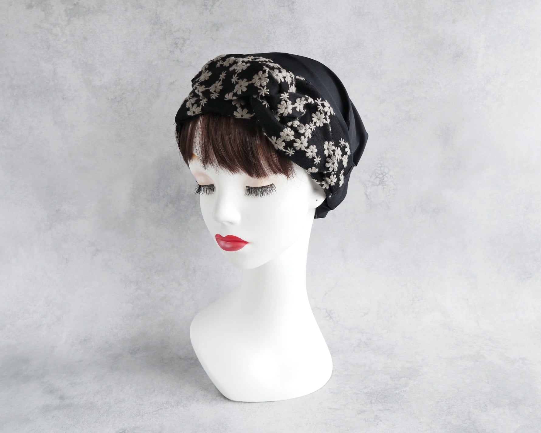 An elegant hair turban with olive-colored floral embroidery tulle layered with cotton to bring out the delicacy and softness.